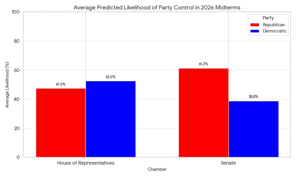 Here are the individual model results as of July 22, 2025, for which party is most likely to win control of both Congressional chambers in 2026.