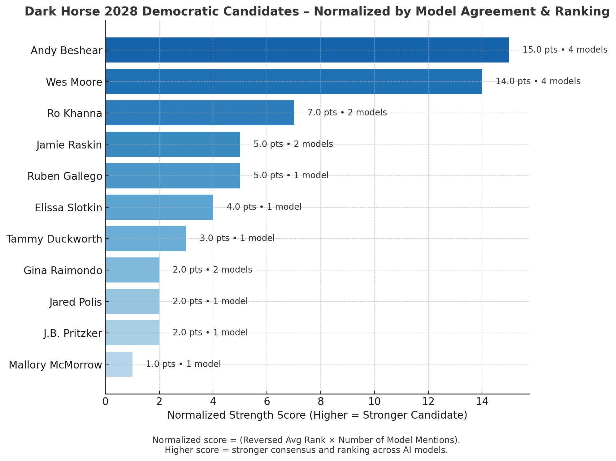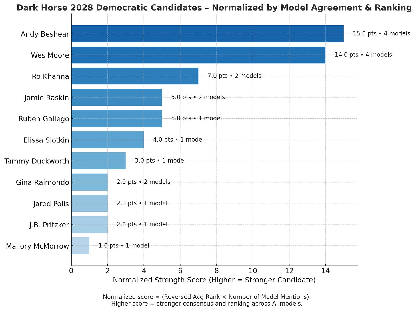 Among the possibilities mentioned, Kentucky’s Andy Beshear and Maryland’s Wes Moore rose to the top among all four AI models. Both candidates, in addition to Ro Khanna, would seem like plausible outside options in 2028.