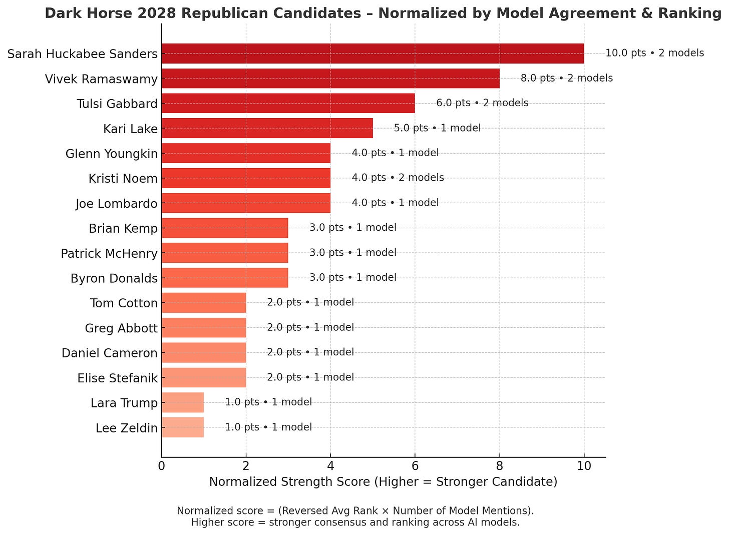 We queried four of the top AI models for a list of dark horse candidates that rarely appear very high in public polling data. Each model was also asked to rank each candidate with a power index. The results were collected, normalized, and presented below for your viewing pleasure.