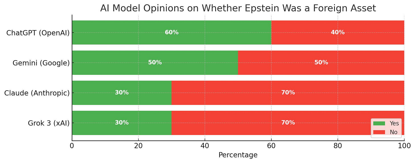 Is there so much garbage, in the unprovable sense, floating around about Epstein that ChatGPT can’t discern whether an allegation should be ruled in or out? Even so, why would it even offer up such a high probability that Epstein is a foreign asset compared to its peers?